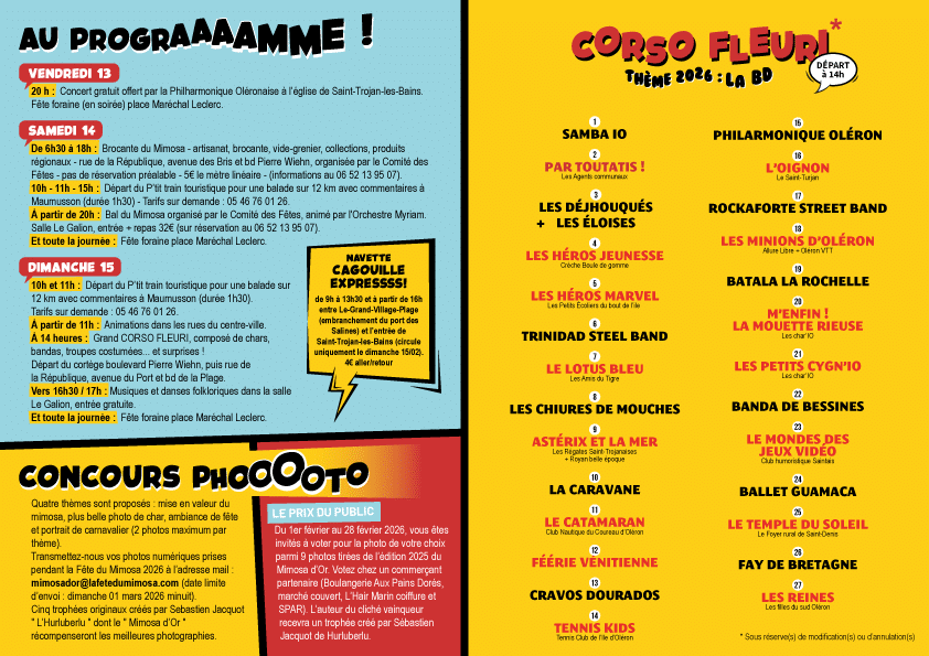 L’hiver à Saint-Trojan-les-Bains ne serait pas le même sans l’éclat doré du mimosa ! Notre village insulaire célèbrera la 67ème édition de la Fête du Mimosa, un événement incontournable où traditions, joie de vivre et créativité se rencontrent. Le thème sera la bande dessinée.